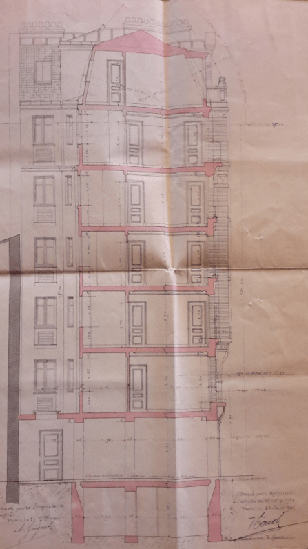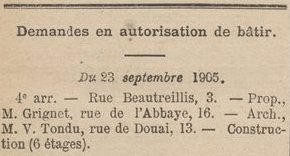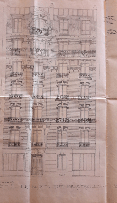 En 1905, les héritiers de Jean-Charles Barrault mirent en vente la propriété du 3 rue Beautreillis par adjudication, avec une mise à prix de 23 000 francs, soit au même prix que quarante ans plus tôt, annonçant des revenus locatifs bruts d’un montant de 1700 francs[36]. La petite maison construite par Jean Bouvet avait sans doute mal vieilli. Surtout, sur cette parcelle, Jean Grignet, son nouveau propriétaire, pouvait envisager de faire construire un immeuble plus imposant, à même de lui assurer des revenus conséquents. Il déposa donc en septembre 1905 une « demande en autorisation de bâtir » pour une construction de six étages [37] et il confia à l’architecte Victor Tondu le soin d’en établir les plans.
