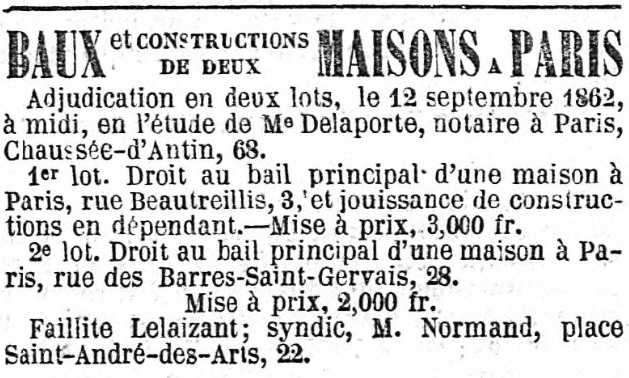 Est-ce le même Lelaizant dont la maison de négoce sise rue des Barres-Saint-Gervais fit faillite en juillet 1862 ? [15] En tout cas, dès septembre, Bouvet met en vente par adjudication et mise à prix de 3000 francs le droit au bail principal de sa maison de la rue Beautreillis, avec « jouissance de constructions en dépendant »[16].