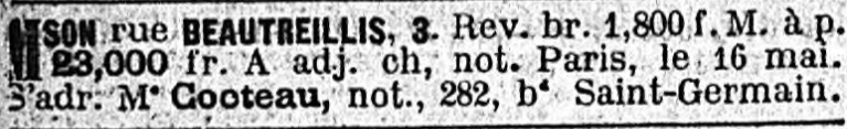 Jean Bouvet, installé dans les lieux sans doute comme locataire en 1838 ou 1839, put acquérir la petite maison et le hangar après le décès, en novembre 1839[7], de son propriétaire, un autre maçon nommé Nicaud[8]. Ce dernier disposait d’une certaine aisance et laissait des biens qui furent vendus par adjudication par ses héritiers l’année suivante[9]. Outre sa maison du 15 rue du Petit-Musc et une maison de campagne, située à Saint-Mandé, mises à prix respectivement 23 000 et 26 000 francs, son « autre maison située à Paris, rue Beautreillis, ci-devant rue Gérard-Beauquet, 3 », fit également partie de la vente. Sa mise à prix à 6500 francs reflétait bien la modestie du bien acquis par Jean Bouvet.