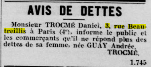A côté des entreprises de plomberie, d’autres commerçants occupèrent boutique ou local au 3 rue Beautreillis dans le dernier quart du XIXe siècle. De 1870 à 1873, un dénommé Perret y vendait du café torréfié[31]. Il fut remplacé par Denis-Augustin Chauvin, mais celui-ci fit faillite en décembre 1876[32]. Petitjean, dans le même négoce, ne tint qu’une année entre 1878 et 1879, puis Damerval, d’abord comme marchand de café, puis comme épicier, put se maintenir dans les lieux jusqu’en 1906. Les années précédentes avaient pourtant été difficiles pour Damerval, puisque qu’en 1874, associé avec un nommé Dourneau dans un commerce d’épicerie au 8 rue Beautreillis, ils avaient alors été déclarés en faillite[33]. Peu de temps après avoir repris la boutique de marchand de café du 3 rue Beautreillis, la jeune épouse de Damerval mourut à l’âge de vingt ans, en avril 1879. Quelques mois plus tard, en décembre, il se remariait avec une demoiselle Koenig, gouvernante domiciliée rue D’Argout[34].
