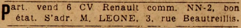 revendre son fonds de commerce « comprenant le matériel, la clientèle, le droit au bail des lieux et les marchandises en dépendant »[49]. Il vendit aussi sa 6 CV Renault, signe peut-être que ses affaires allaient vraiment mal ! Son successeur, Laurent, ne tint pas plus d’une année lui aussi, et la boutique resta visiblement inoccupée jusqu’en 1945, laissant la cordonnerie de Graziosi animer seule le pied de l’immeuble.