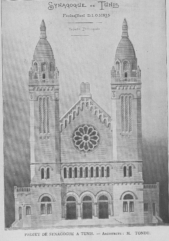Mais le projet phare de Victor Tondu fut la Grande synagogue de Tunis. Toujours associé à Daniel Iffla Osiris, là encore à l’origine du projet de construction, l’architecte se rendit à Tunis en mai 1905 pour exposer devant la Commission des notables de la communauté juive de la ville les conditions du mécène pour « doter Tunis d’une grande et belle synagogue moderne »[41].