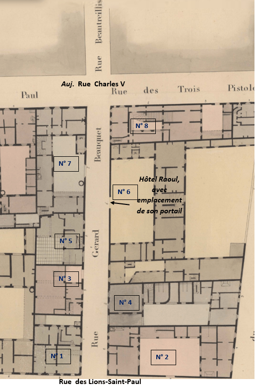 Le début de la rue Beautreillis, compris entre la rue des Lions-Saint-Paul et le croisement avec la rue Charles V, a porté jusqu’en 1838 le nom de Gérard Beauquet [1]. Elle forme aujourd’hui un ensemble disparate avec, en son centre, le portail de l’ancien hôtel Raoul. Vestige abandonné en bord de trottoir et définitivement clos, il orne comme il peut au numéro 6 l’imposant immeuble qui, dans les années 1960, a remplacé l’ancien hôtel. Enserrée entre cette construction sans grâce et l’annexe de l’école Massillon élevée en 1933, proue de béton marquant l’entrée de la rue, subsiste la vieille demeure aux vantaux de bois clouté sise au n° 4.