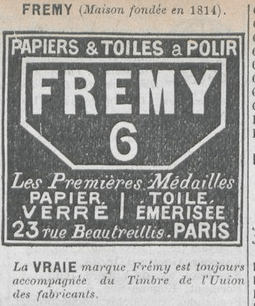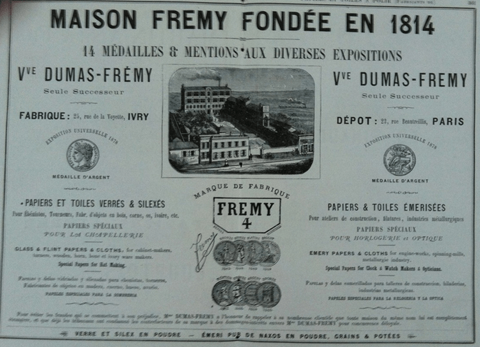[3] « Rapport sur les nouveaux perfectionnements apportés par M. Frémy dans la fabrication des papiers et toiles verrés et émerisés, par M. Chevallier », Bulletin de la Société d’encouragement pour l’industrie nationale, 1846, 45e année, n° 499-510, p. 69-72. CNAM-CNUM – Bibliothèque numérique du CNAM http://cnum.cnam.fr/CGI/sresrech.cgi?BSPI.45/73