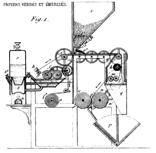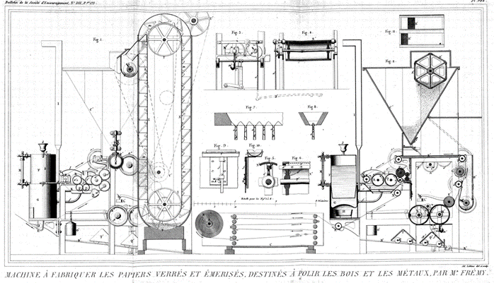 [4] Voir « Description d’une machine propre à fabriquer les papiers verrés et émerisés destinés à polir les bois et les métaux, par M. Frémy, rue Beautreillis », Bulletin de la Société d’encouragement pour l’industrie nationale, 1846, 45e année, n° 499-510, p. 172-176. CNAM-CNUM – Bibliothèque numérique du CNAM http://cnum.cnam.fr/CGI/fpage.cgi?BSPI.45/182/70/788/8/636. Voir aussi Le Génie industriel, 1852, vol. 2, p. 151-153 [CNAM-CNUM – Bibliothèque numérique du CNAM http://cnum.cnam.fr/CGI/sresrech.cgi?P939.2/155
