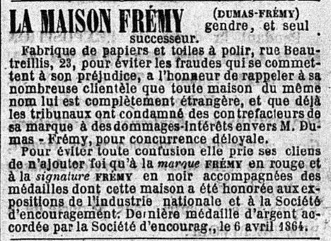 Peu après la mort de son épouse, Louise-Annette-Sophie Lavigne, le 4 octobre 1853[21], François Frémy se retira des affaires et la direction de la fabrique de papier de verre de la rue Beautreillis passa à son gendre, Charlemagne-Louis Dumas. Né en 1823[22], Dumas avait épousé en 1847 l’une des deux filles de Frémy, Louise-Elisabeth-Charlotte[23]. Associé aux activités de son beau-père, il prit la direction de la fabrique dont il accéléra le développement et, soucieux de profiter de la renommée acquise par la maison Frémy, il joignit à son nom celui de son épouse et de son beau-père[24].