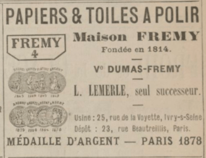 Dumas, en 1879[29], sa veuve , qui aurait été « le vrai patron » et qui avait fait bâtir à Ivry, en plus des ateliers, « un pavillon d’habitation pour sa famille et une écurie pour six chevaux de travail », s’associa avec un certain Charles Lemerle qui « acquit la société dans le but d’établir son fils Louis, officier d’artillerie, dans le monde de l’industrie. Louise Dumas le ‘coacha’ pendant deux ans avant de se retirer ». Polytechnicien, Louis Lemerle fit passer la production de papier de verre au stade industriel, en acquérant notamment de nombreuses sociétés concurrentes et en transformant l’ancienne maison Frémy en Compagnie centrale des émeris et produits à polir[30].
