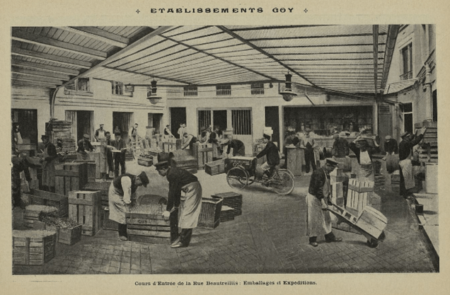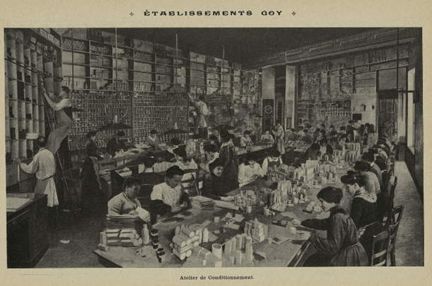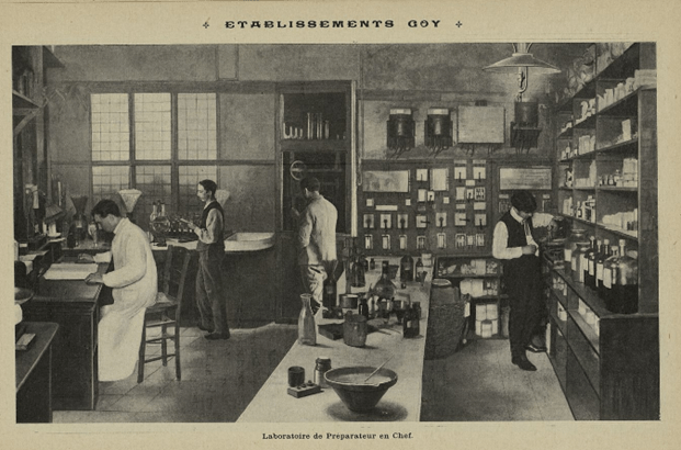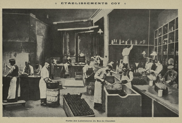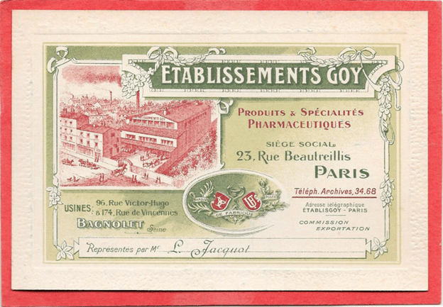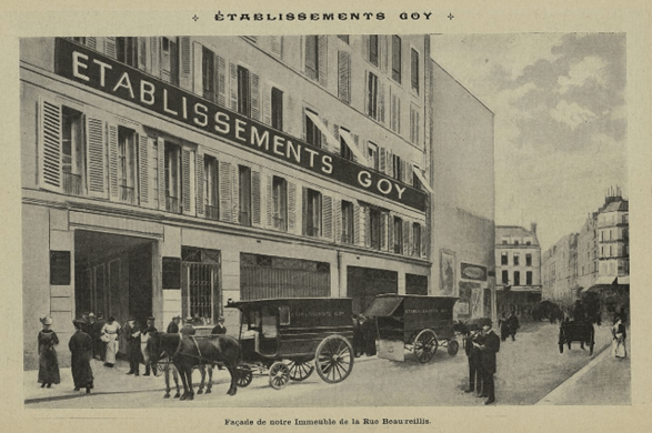 Acquéreurs de la société de Soulignoux en 1891, L. Rozet et son associé Bouniol vendirent à leur tour en 1895 « leur usine de fabrication de produits pharmaceutiques conditionnés au nom du pharmacien et avec la marque de ladite usine […], ainsi que la fabrication des pastilles, dragées, pilules, granules et produits analogues » à Adophe Goy et Alfred Otto Jaeger[32]. Jaeger, un pharmacien de Mulhouse, se retira de l’affaire en 1901. Adolphe Goy, puis la société qu’il avait créée, occupa rapidement l’intégralité de l’immeuble à partir du début du XXe siècle, et cela jusqu’en 1965. Goy était lui aussi pharmacien de profession et avait auparavant tenu une officine en Seine-et-Oise, puis au 4 faubourg Poissonnière.  Mais dépassé par le développement de son affaire dont la valeur du fonds de commerce avait triplé et les stocks doublés en cinq ans[33], il fut obligé de changer ses statuts en société anonyme en 1905 et de laisser la direction à un conseil d’administration[34]. L’activité déclarée de la Société des établissements Goy était « l’achat, la fabrication, la consignation, la commission, l’exportation, et, en général, l’exploitation de tous les produits chimiques, de droguerie, d’herboristerie, de parfumerie, d’alimentation, de confiserie, etc…, et toutes préparations et spécialités se rapportant à ces diverses branches »[35]. Même après la construction en 1907 d’une nouvelle usine à Bagnolet, l’immeuble de la rue Beautreillis, siège social de la nouvelle société Goy, resta un lieu de fabrication de produits pharmaceutiques[36].