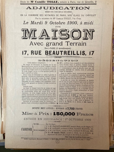 Les héritiers de Flavigny s’empressèrent de mettre l’hôtel en vente, en même temps qu’une autre propriété du vicomte, « une vieille maison »[2] située 33 rue des Petits-Champs. En décembre 1899, les deux biens furent mis aux enchères, chacun avec une mise à prix de 250 000 francs[3]. Mais lors de la vente, le 26 décembre 1899[4], aucune des propriétés ne trouva preneur. Un prix de départ trop élevé fut peut-être la raison de cet échec. Pourtant, quelques mois plus tard, en octobre, lorsqu’une nouvelle adjudication fut lancée, la maison de la rue des Petits-Champs, avec une mise à prix identique, partit à 320 500 francs. Un investissement spéculatif selon la presse spécialisée pour une «affaire de terrain », l’acheteur comptant démolir la maison avant « la fin des baux »[5]. Remise aux enchères lors de cette même vente, la mise à prix de l’hôtel de la rue Beautreillis fut en revanche fortement diminuée et réduite à 150 000 francs, cela malgré le jardin, « terrain à bâtir » de 1500 m² [6]. Il faut dire que pour le malheur des vendeurs, la valeur de la propriété était au même moment fortement compromise par l’annonce de projets d’aménagement du passage Saint-Pierre et de son prolongement vers la rue Beautreillis.
