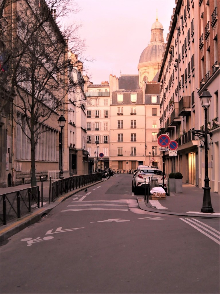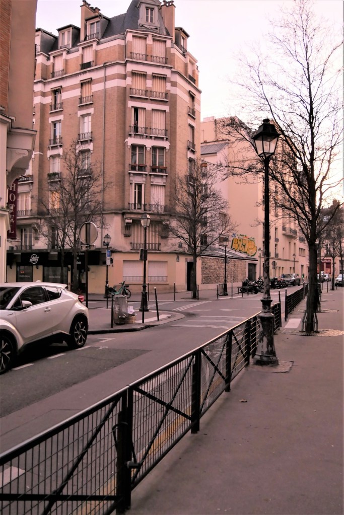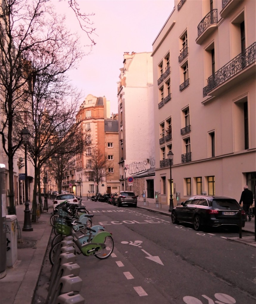 Aujourd’hui. A l’angle de la rue de l’Hôtel-Saint-Paul, on aperçoit l’autre immeuble de briques. Construit en 1927[3] c’était un hôtel meublé pour les ouvriers qui, de plus en plus nombreux, venaient travailler dans les ateliers et usines du quartier. C’est de nos jours devenu un hôtel 3 étoiles fréquenté par les touristes. Au premier plan, station Vélib’ et alignement de bornes de rechargement pour voitures électriques ont fini d’enlaidir cette partie de la rue Neuve-Saint-Pierre.