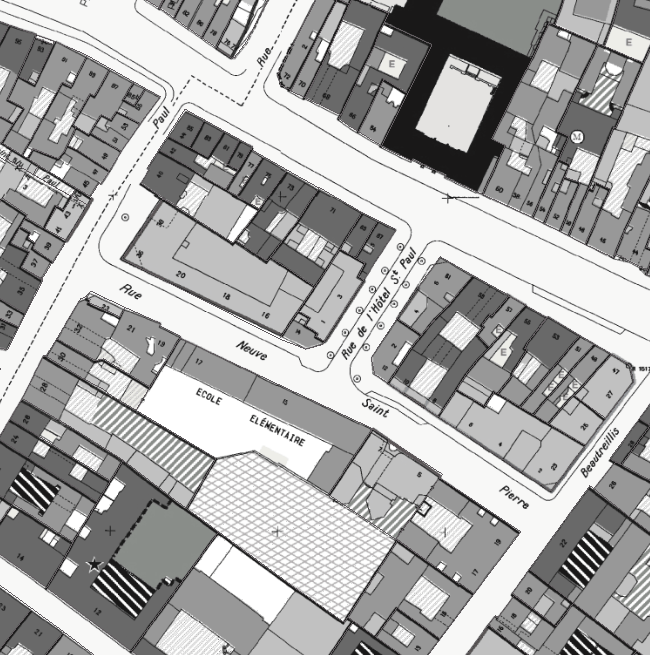 Le même endroit aujourd’hui. Deux immeubles en briques à pan coupé bâtis dans l’entre-deux guerres marquent les angles de la rue de l’Hôtel-Saint-Paul et de la rue Neuve-Saint-Pierre. Ces constructions, qui font écho avec la façade de briques de l’école primaire située de l’autre côté de la rue, sont la seule manifestation d’un essai de mise en ordre ou d’aménagement architectural.