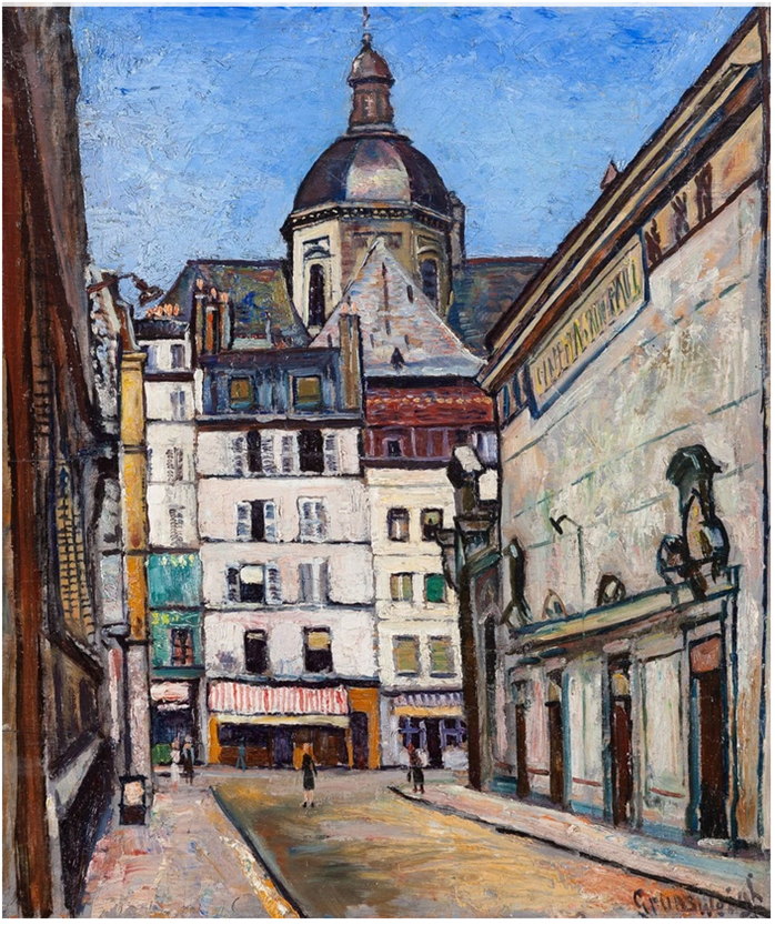 Nous sommes dans l’entre-deux-guerres. Le beau tableau du peintre Nathan Grunsweigh (1880-1956) représente la même perspective de la rue Neuve-Saint-Pierre que les photos d’Atget. Il nous renseigne sur l’aspect de la façade du cinéma Saint-Paul dont l’entrée principale était située rue Saint-Antoine.