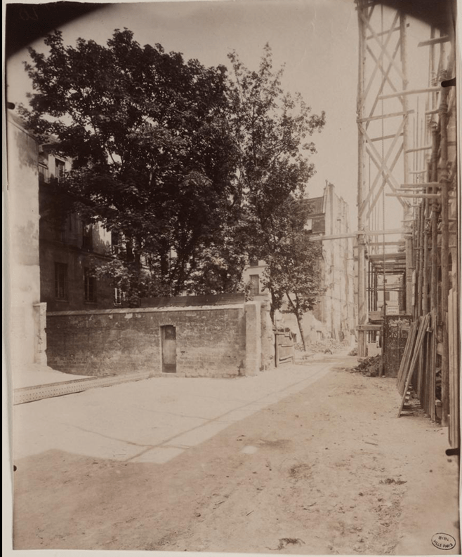 1914. Atget a remonté la rue Neuve-Saint-Pierre vers la rue Beautreillis. L’orientant de nouveau en direction de la rue Saint-Paul, il a posé son appareil là où se dressait peu de temps auparavant l’ancien hôtel du 21 rue Beautreillis. Plus loin, le bâtiment de la crèche et l’arbre de sa cour, puis tout au fond, la rue Saint-Paul. A gauche, le chantier de la nouvelle école primaire alors en construction.