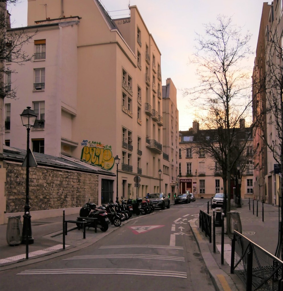 Aujourd’hui. Les murs pignon du 23 rue Beautreillis ont été remontés, ravalés, percés de fenêtres et embellis de balcons sans pour autant parvenir à se transformer en véritables façades. De l’autre côté, le pignon ravagé de l’immeuble du n° 17-19 est resté pratiquement en l’état. Recouvert d’une sorte de fresque ratée de couleur rose, soumise comme ailleurs aux ravages des tags, c’est assez naturellement que ce coin de la rue Neuve-Saint-Pierre et de la rue Beautreillis est devenu un lieu tout désigné pour le dépôt sauvage des encombrants et autres déchets. On s’en plaignait d’ailleurs déjà au milieu du siècle dernier quand marchands des quatre saisons de la rue Saint-Antoine et artisans et industriels du quartier jetaient au même endroit qu’aujourd’hui légumes avariés et débris de toutes sortes [1].