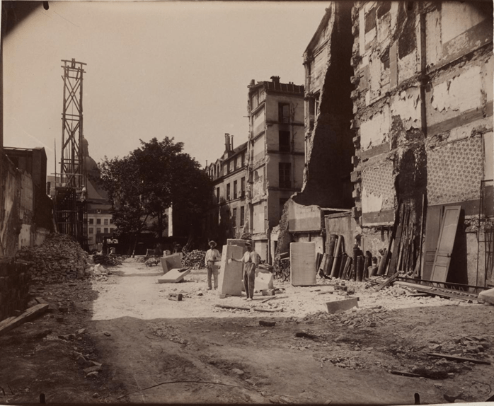 1914. Atget a avancé son appareil d’une vingtaine de mètres et fixé son objectif sur la perspective ouverte sur la rue Beautreillis au prix de la démolition de l’ancien hôtel qui s’élevait au numéro 21. Les pignons mis à nu des immeubles voisins et leur damier de papier peint sont autant de marques de blessures. En face, la brèche ouverte a dévoilé, au 22 rue Beautreillis, la façade de l’hôtel de Charny où Baudelaire vécut quelques mois auprès de sa maîtresse Jeanne Duval.