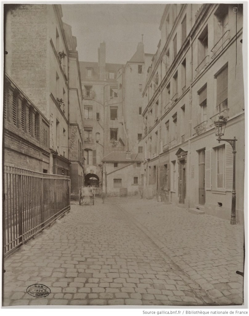 Nous sommes en 1905. Près de quarante ans après la gravure de Delauney, cette photo d’Atget montre la même partie du passage Saint-Pierre débouchant vers la rue Saint-Paul telle qu’elle était alors. On passait par le porche percé sous l’immeuble situé en bout pour y entrer ou en sortir. A gauche, des grilles délimitaient l’emprise de l’école communale de garçons construite en 1845, voisine de deux petits immeubles d’habitation. A droite s’alignaient les maisons où, jusqu’à la Révolution, logeaient les prêtres qui servaient l’ancienne église Saint-Paul. Elles furent en partie rebâties à la fin du XIXe siècle.