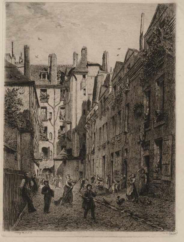 L’abandon de leurs hôtels du Marais par la noblesse, les officiers et les parlementaires au profit du faubourg Saint-Germain et des nouveaux quartiers de l’Ouest, déjà bien marqué à la fin de l’Ancien régime, prit un tour définitif avec la Révolution. « Ceux qui possédaient encore des hôtels au Marais ont définitivement renoncé à y demeurer. Bien au contraire, ils encouragent leur fractionnement en petits logements, leur reconversion en ateliers, magasins ou hangars, afin de multiplier les locations et, par conséquent, leurs revenus »[8], ces transformations amenant un afflux de population ouvrière et aussi d’indigents.