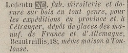 En 1835, Ledentu et Boyé transférèrent leur atelier au 35, de la rue Saint-Louis-au-Marais (rue de Turenne aujourd’hui)[25]. A la fois miroitiers et commissionnaires en articles de Paris, leurs affaires prospérèrent suffisamment pour étendre leur aire de chalandise et l’expédition de leur production dans toute la France, voire jusqu’à l’étranger. Dès 1832, ils ouvrirent une succursale à Bordeaux[26] dont la direction fut confiée au frère de Paul, Alphonse-Pierre Ledentu (1803-1867).
