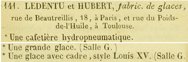 La succursale de Bordeaux acquérant son autonomie sous la direction d’Alphonse-Pierre Ledentu, ce fut au développement de leur magasin de Toulouse que Paul Ledentu et Boyé consacrèrent leurs efforts. Ils participèrent notamment à partir de 1835 aux expositions des produits des beaux-arts et de l’industrie qui se déroulaient régulièrement dans la ville, obtenant des citations. Si l’association entre Ledentu et Boyé semble avoir continué rue Saint-Louis à Paris jusque vers 1838-1840[28], c’est avec un nouvel associé, Hubert, que Paul Ledentu poursuivit l’activité de la succursale de Toulouse à partir de 1837. Sans être fabricants de glaces, ils proposaient des miroirs montés « avec goût et même luxe », occupant « dans leurs ateliers plusieurs ouvriers de la ville »[29]. Paul Ledentu développa son réseau de succursales dans le sud-ouest, ouvrant un magasin à Pau, place Royale[30], mais aussi dans le reste de la France : pour les années 1850, on trouve même à Besançon un « Dépôt de glaces des manufactures de France » de la fabrique de miroiterie Ledentu et Cie, de Paris[31].