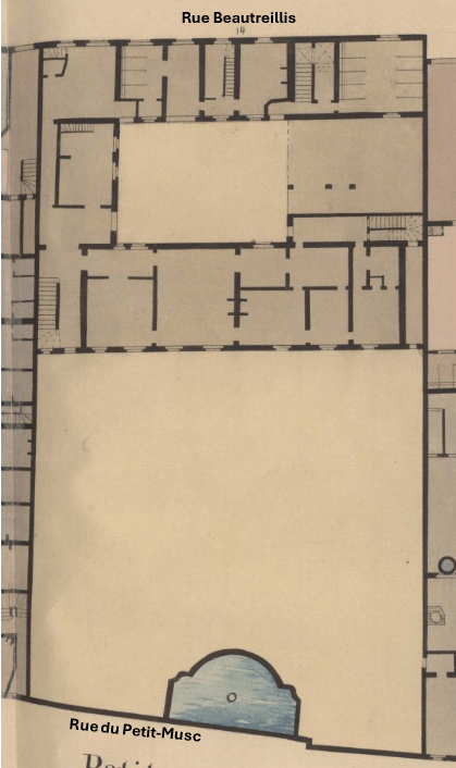 Quittant à la fin des années 1850 la rue Beautreillis pour aller habiter 8, rue du Parc-Royal[56], dans l’ancien hôtel Duret de Chevry, Paul Ledentu se défit peu à peu de ses propriétés. En décembre 1856, il mit en vente la maison qu’il possédait rue des Filles-du-Calvaire et qui lui assurait un revenu annuel de 8 300 francs[57]. En février de l’année suivante, il chercha à vendre aux enchères « en un ou deux lots » et comme « terrain à bâtir » le grand jardin de 721 m² de son hôtel de la rue Beautreillis qui donnait sur la rue de Petit-Musc[58], mais l’opération ne semble pas avoir alors abouti. Ce milieu des années 1850 est également l’époque où des parties de l’hôtel furent transformées et aménagées pour être mises en location auprès d’autres artisans et commerçants, accroissant les revenus apportés jusqu’alors par la location de logements[59]. Quelques années plus tard, en novembre 1863, c’est l’ensemble de la propriété du 22, rue Beautreillis et son « jardin propre à bâtir » qui furent mis en vente par adjudication, peut-être en conséquence de liquidations judiciaires imposées pour couvrir le remboursement de dettes.